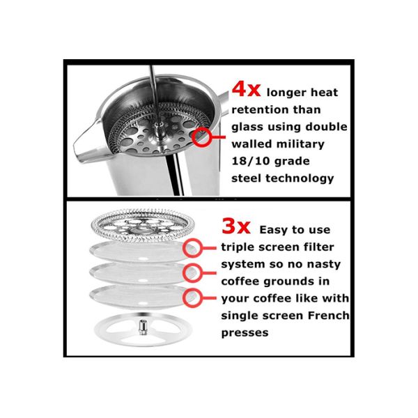 4. High Quality Double Wall Stainless Steel: The high-quality French press tea and coffee brewer 12 oz (350 ml) coffee pot is made from high-quality 18/10 stainless steel . The doubled walled, insulated pot will keep your coffee or tea hot for up to 2 hours. Dishwasher-safe.